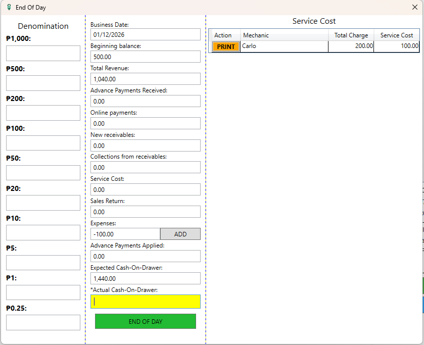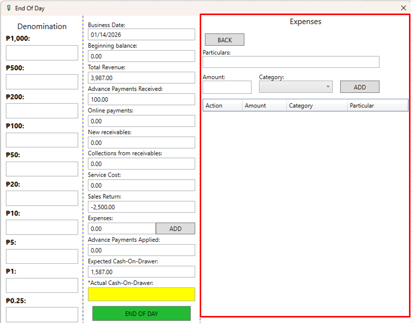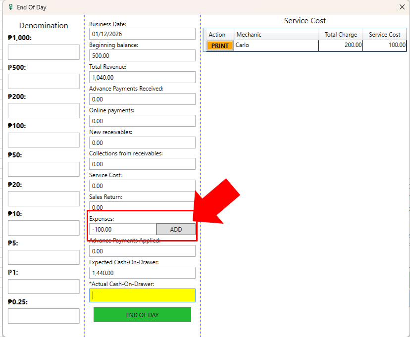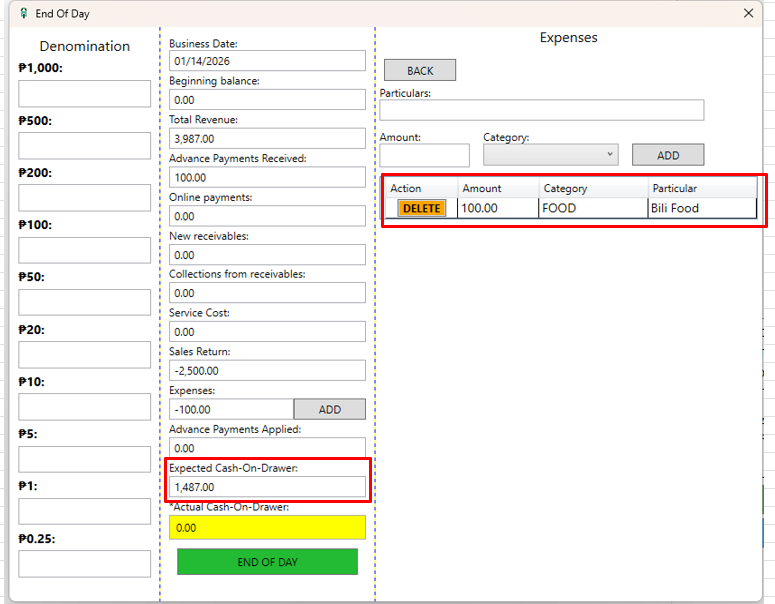 Once Expenses is Added the Expected Cash-on Drawer will be deducted