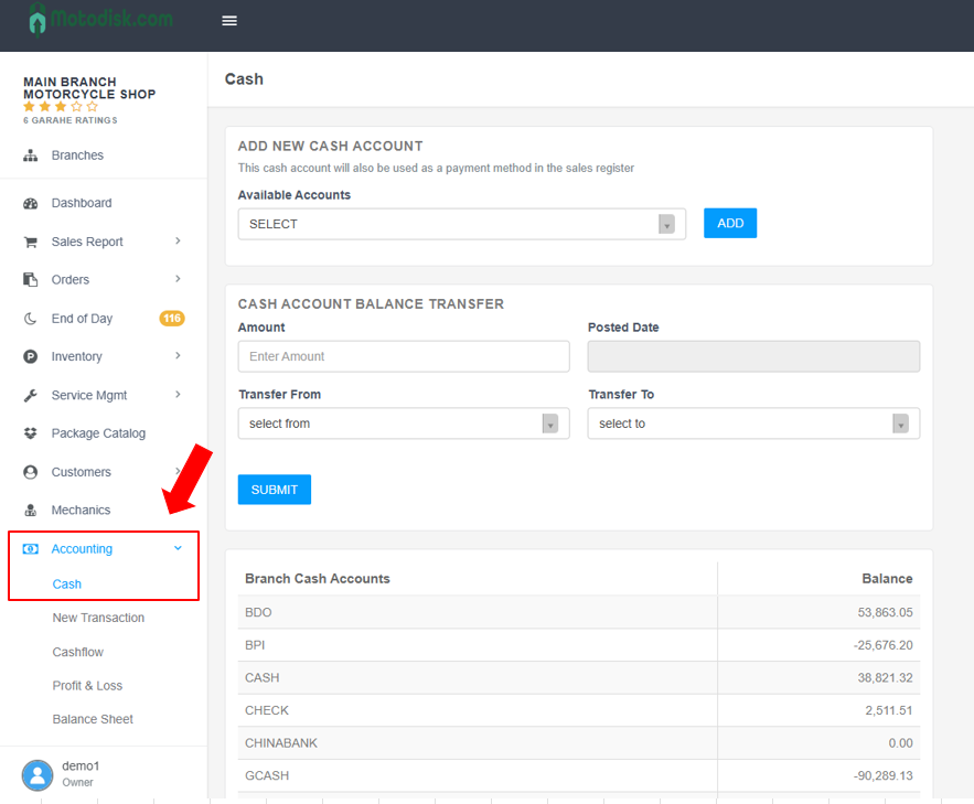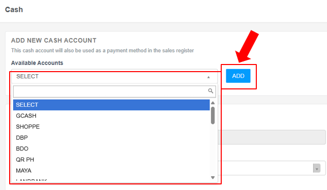 1. Select a cash account type from the dropdown list (e.g. GCash, BDO).