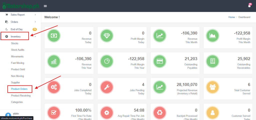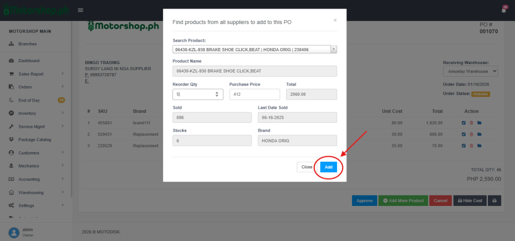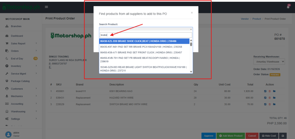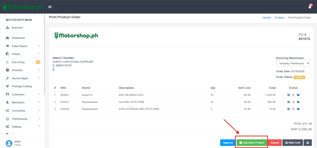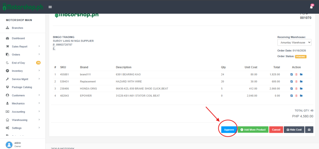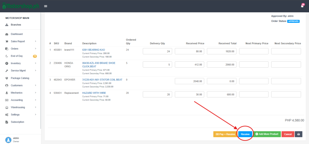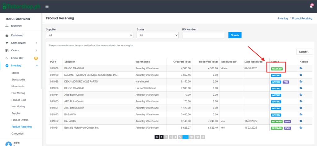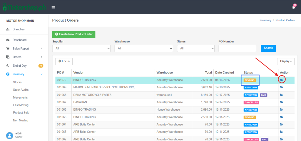 8. Go to Inverntory>Product Recieving find the recent approved PO then click the folder icon.