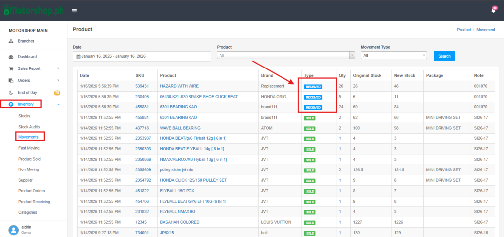 11. Go to Inventory> Movements to see the recent movements of the product.