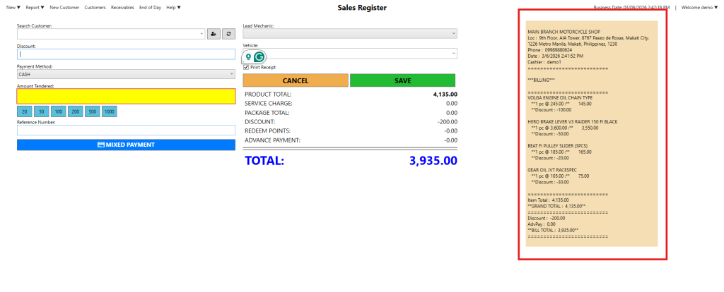 Step 3: Verify the updated Total reflects the deduction and proceed to payment; the receipt will show each specific flat discount applied per item.