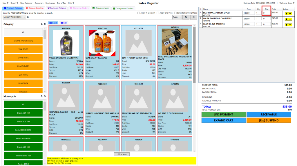 Step 1: In the cart section on the right, click the “0” value under the “Disc” column for the specific product you want to discount.
