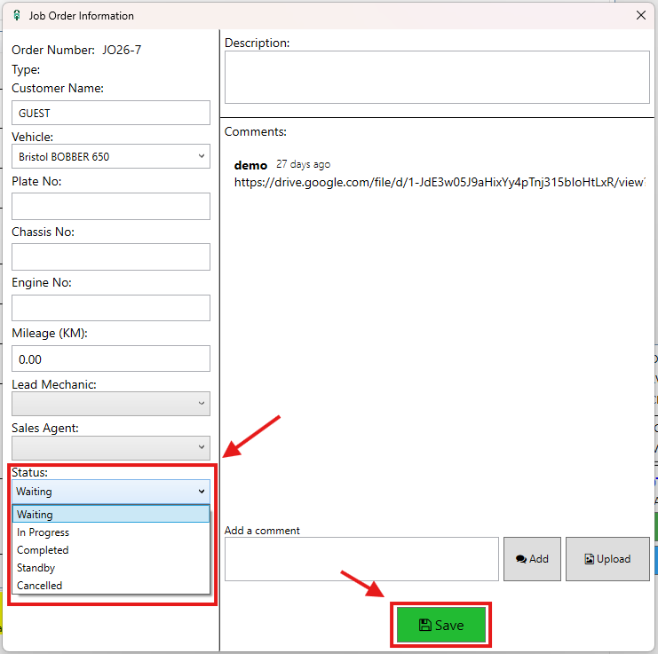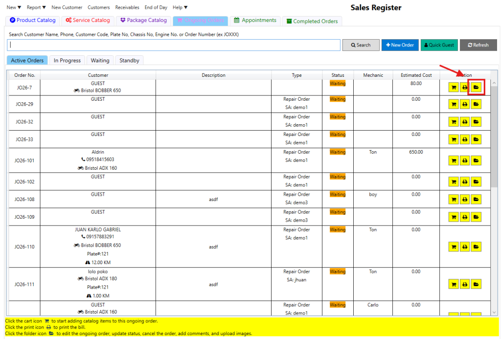 Quick Tip: Using the folder icon allows you to do more than just change the status—you can also add comments or upload images to the job order.