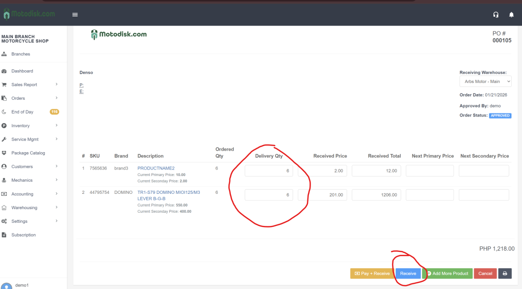 7. Review the Delivery Quantity and adjust if needed, then click the Receive button to confirm the product orders.