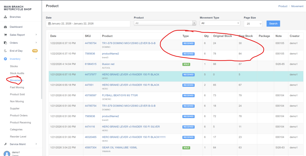 8. Once the product order is received, the delivery quantity will be added to the inventory. You can verify this under Inventory → Movements.