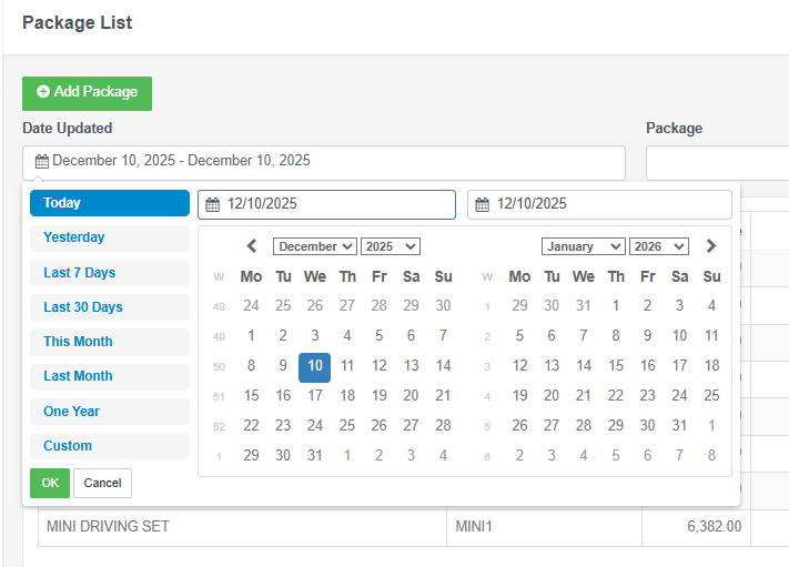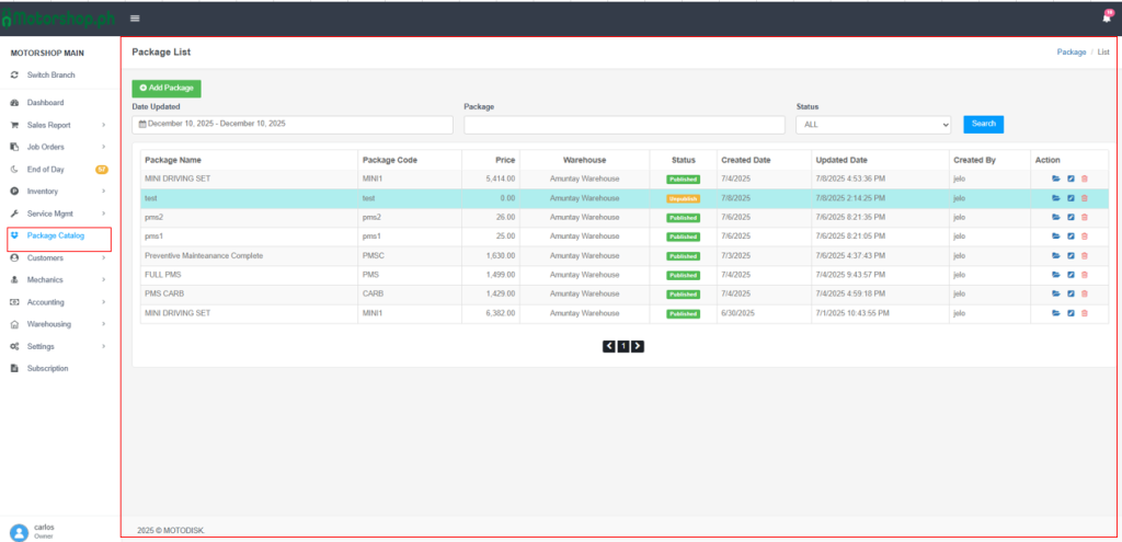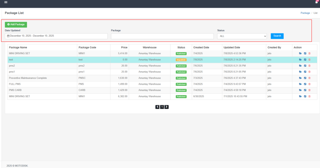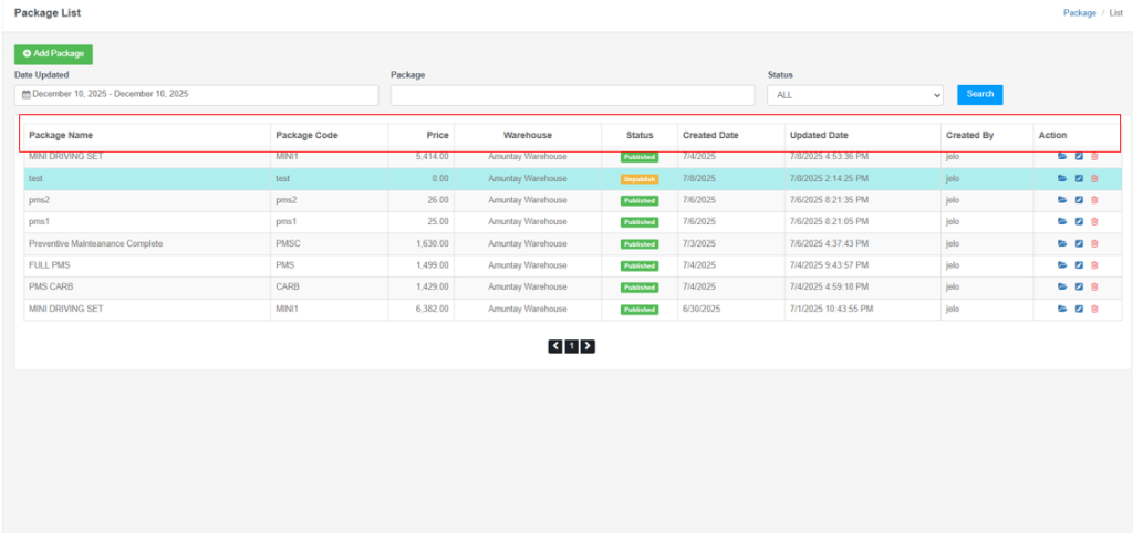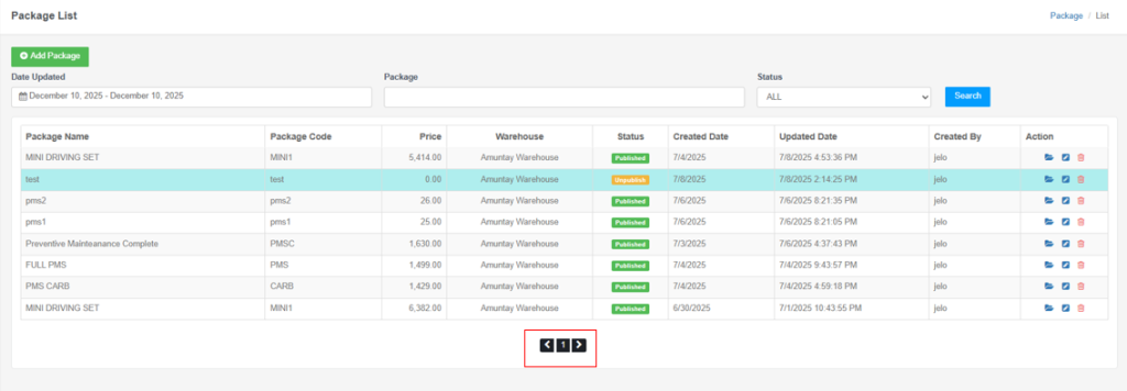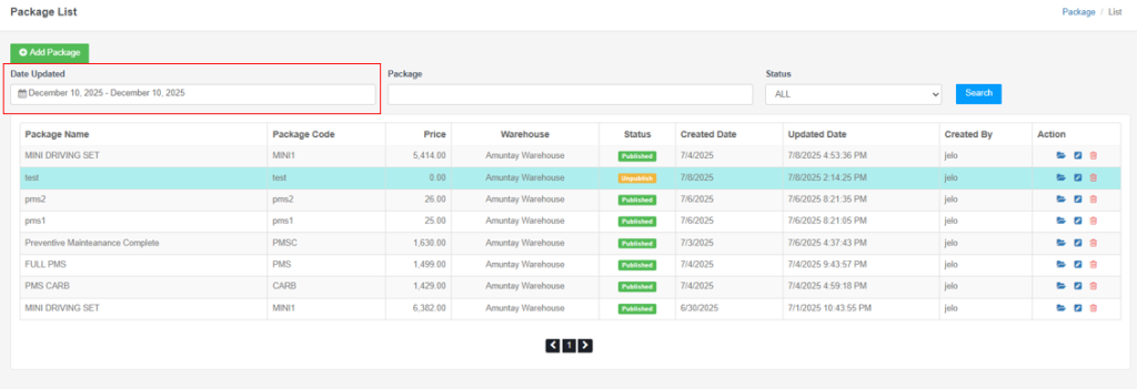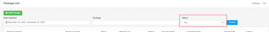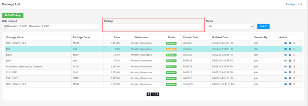 • In the list, use Status filter to find PUBLISHED/UNPUBLISH packages. (If a toggle exists per row, use it; otherwise, edit the package and save with desired status.)
