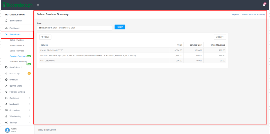 - In the left sidebar, find “MOTORSHOP MAIN“