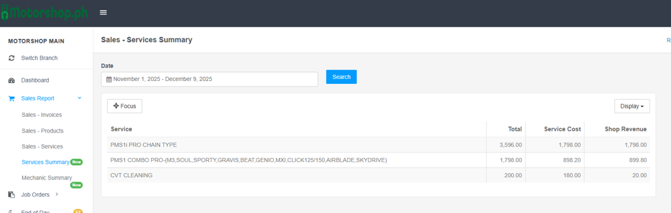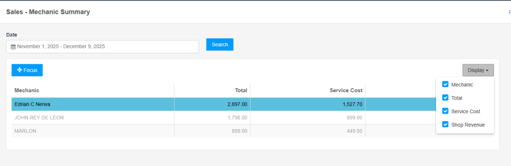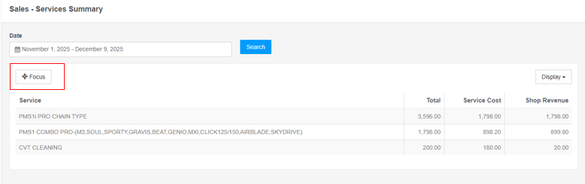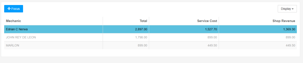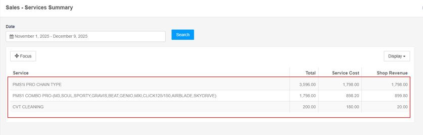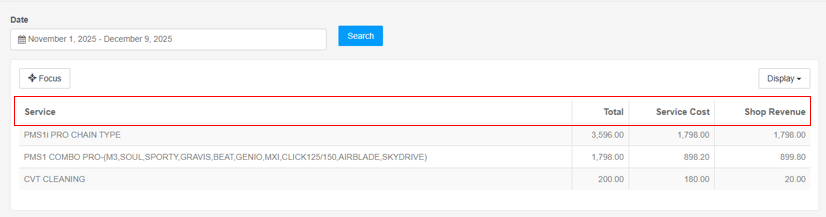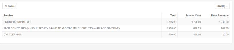 Click Display (top-right of the table) to toggle columns (Service, Total, Service Cost, Shop Revenue).