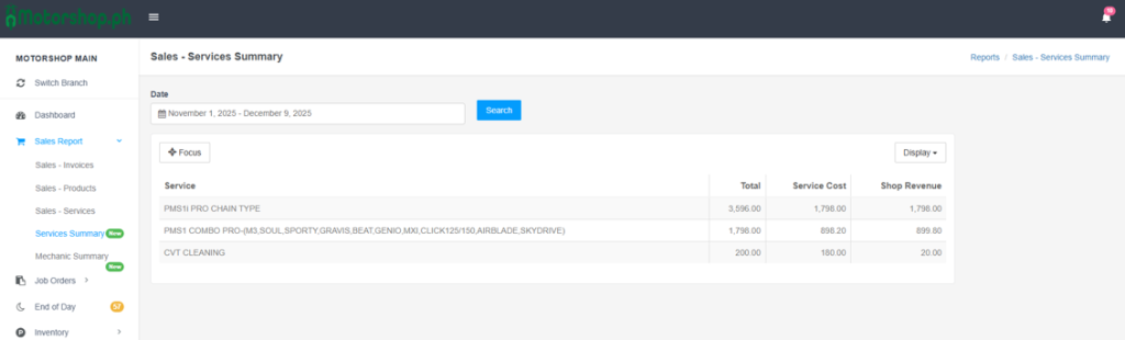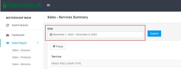 Access the Service Summary page from the left sidebar: click “Sales Report” (shopping cart icon), then select “Service Summary” from the submenu.