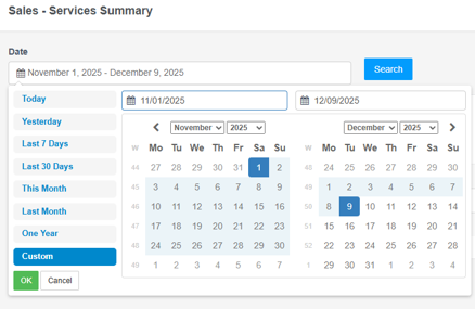 - Choose a quick range (Today, Yesterday, Last 7 Days, Last 30 Days, This Month, Last Month, One Year) or use Custom to pick start/end dates.