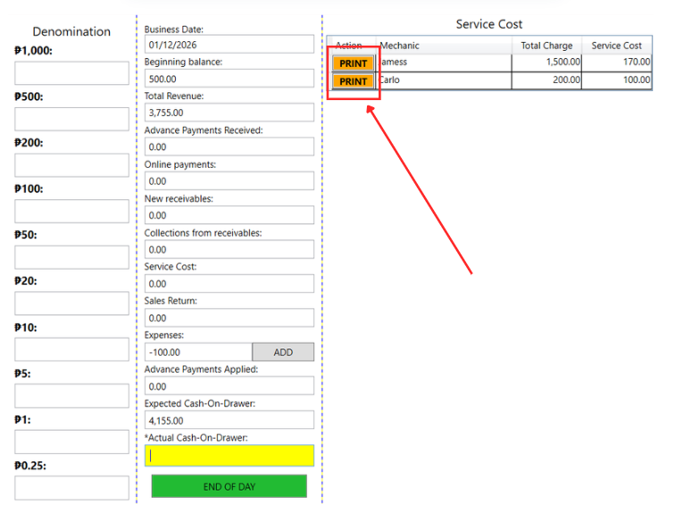 Step 3: Click the Print button to print the Mechanic’s labor and Service Cost.