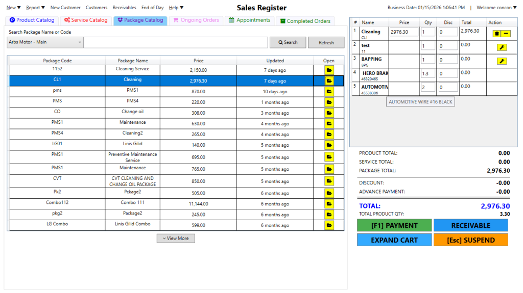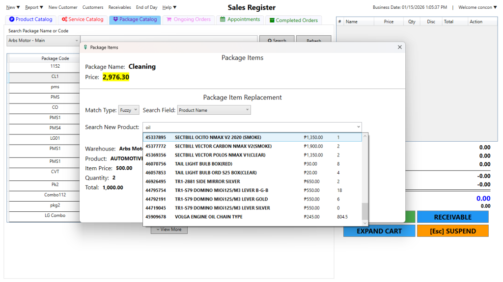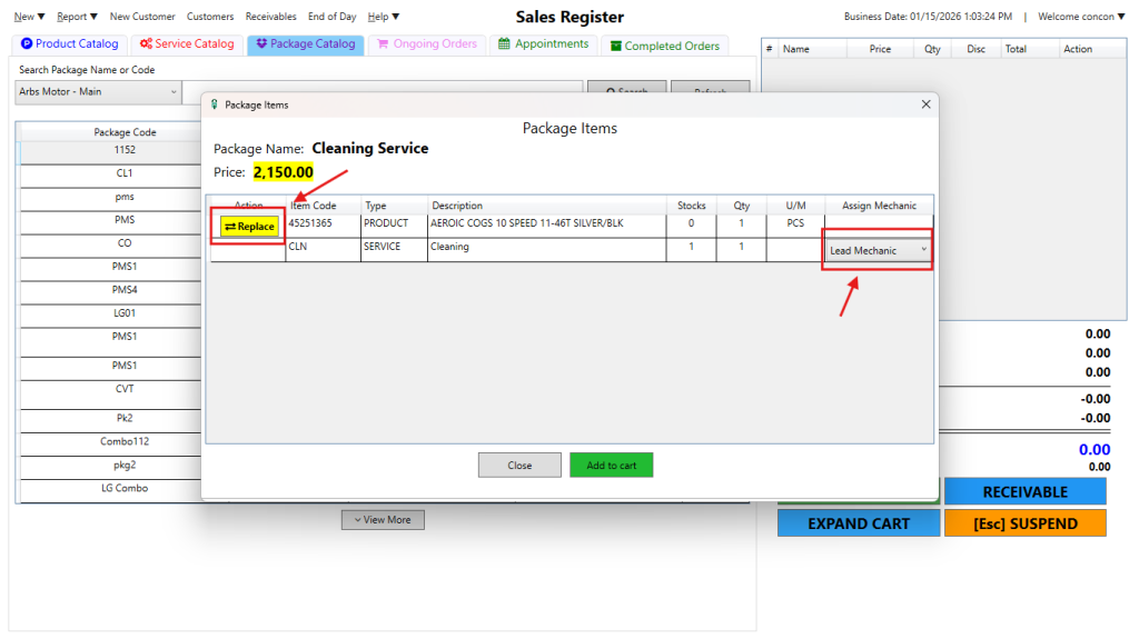 Step 4: Select Mechanic assigned to this customer and replace product, as needed. Then Add to Cart