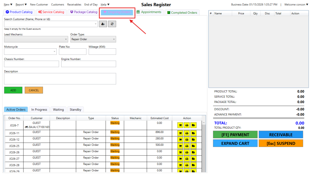Step 2: Job order is now added at it is displayed at the bottom of the list