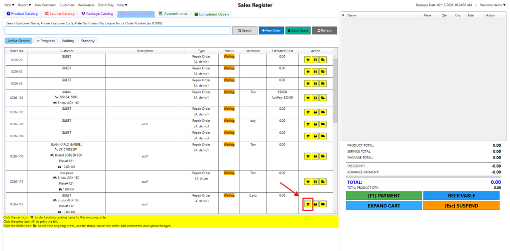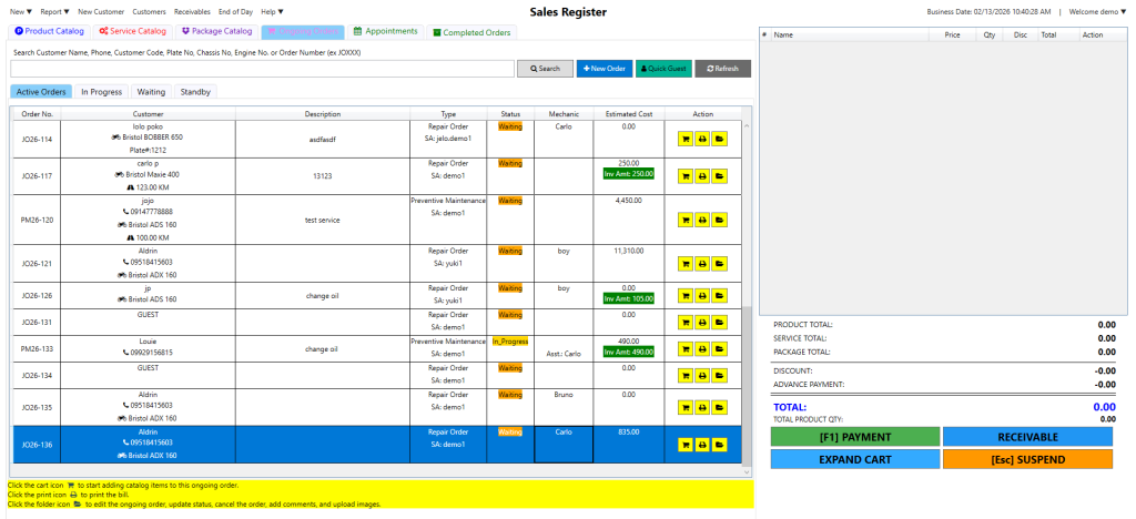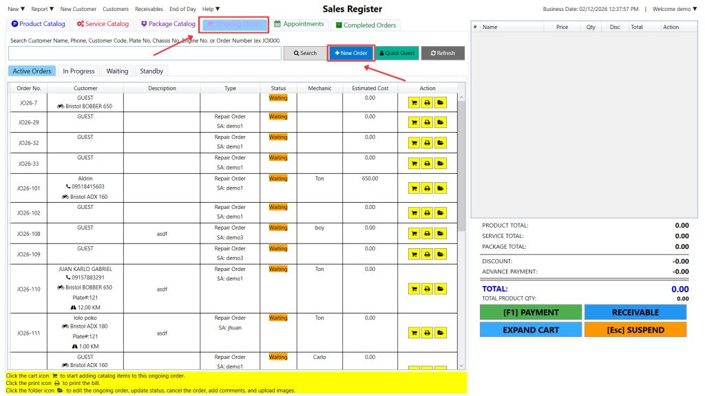 Step 4: Your ongoing job order will now display in the list of orders. If you want to see it, click Ongoing Orders, you should see it at the bottom of the list. Notice that it has already captured the added product and/or service.