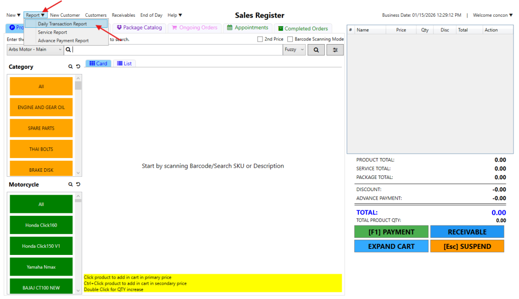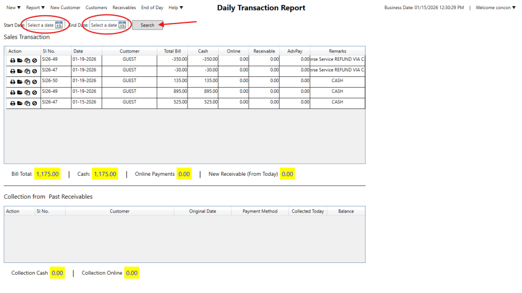 Step 2: You’ll see today’s sales by default. To check past transactions, just choose the date you want and click Search.