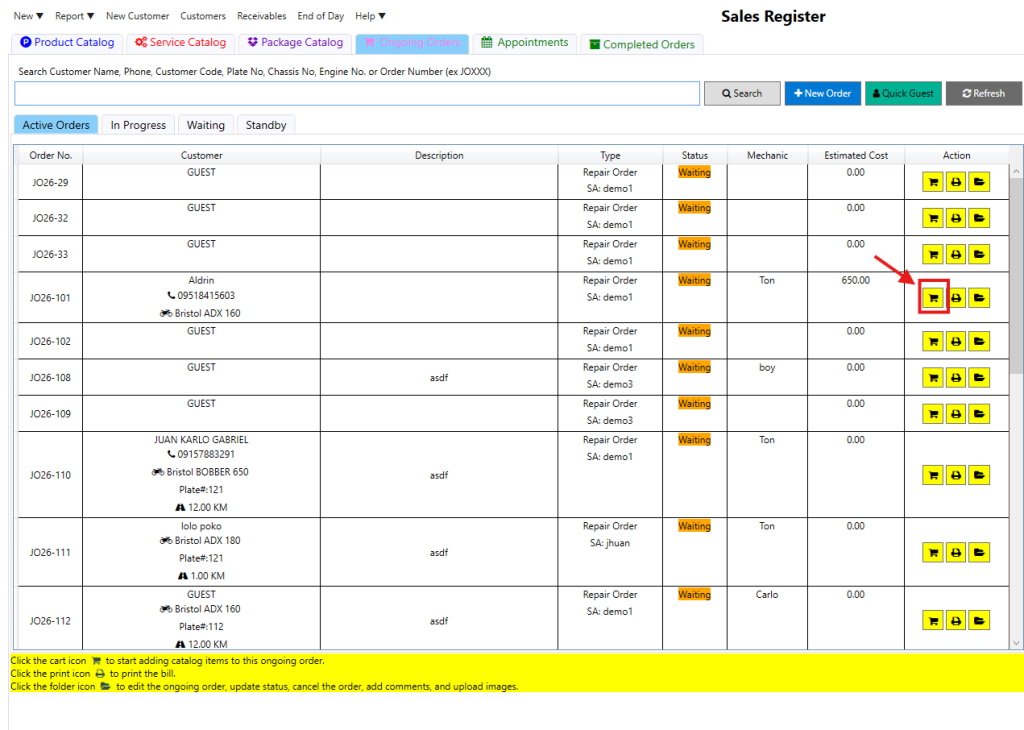 Step 2: Click the cart icon for the specific order to open the Order Cost Estimate.