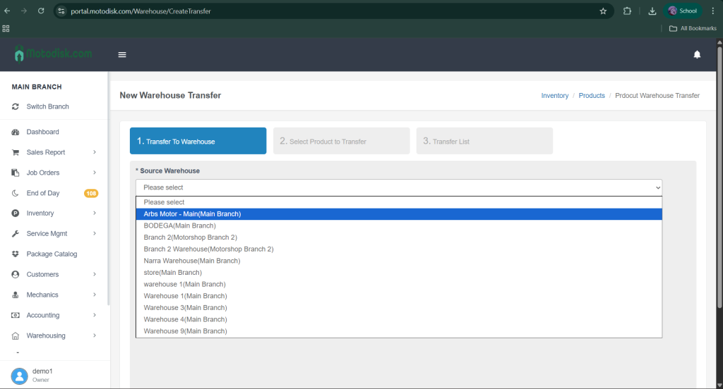5. After clicking Create Transfer, first select a source warehouse.
