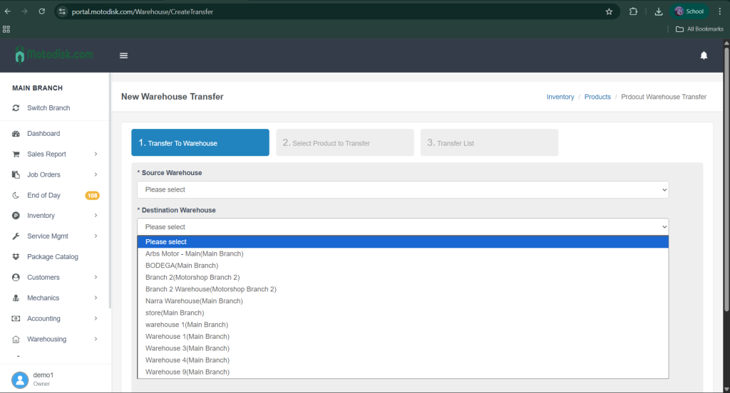 Note: Transfers cannot be made to the same warehouse; the source and destination must be different.