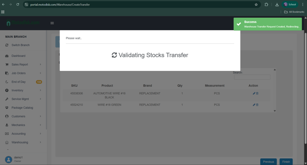 11. Now, confirm the products and quantities you want to transfer to the destination warehouse. You can edit the quantity or delete items if needed. After confirming, click Finish.