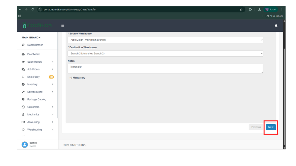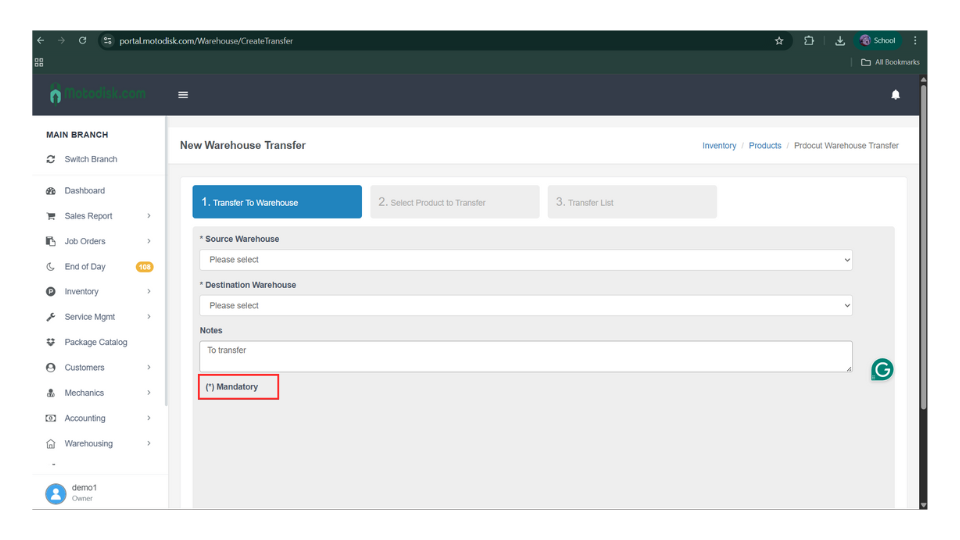 7. After selecting the source and destination warehouses, enter the notes/reason for transfer since it is required.
