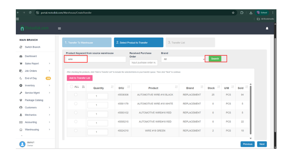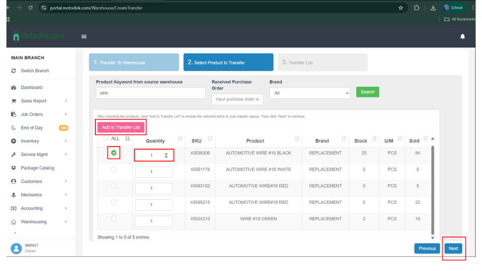 10 . First, select a product by checking it, enter the quantity you want to transfer to the destination warehouse, click Add to Transfer List, and then click Next.