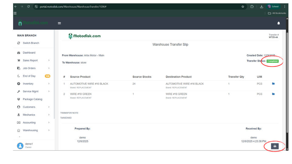 13. Once the transfer status is Completed, you can also print the transfer details.