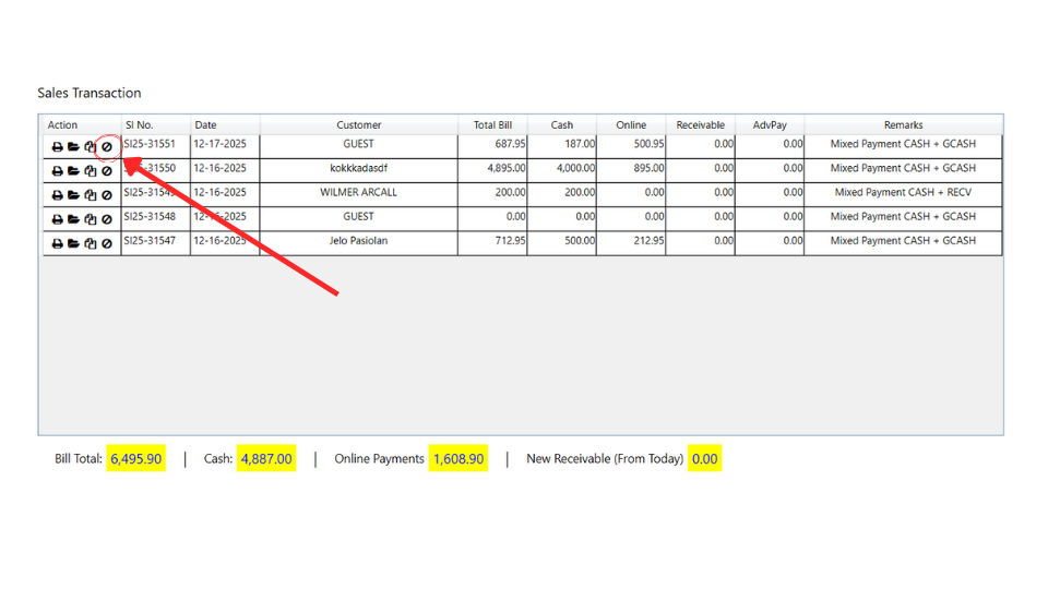 3. In the Sales Transaction section, on the left side, you will see a circle. Click it to void a transaction.